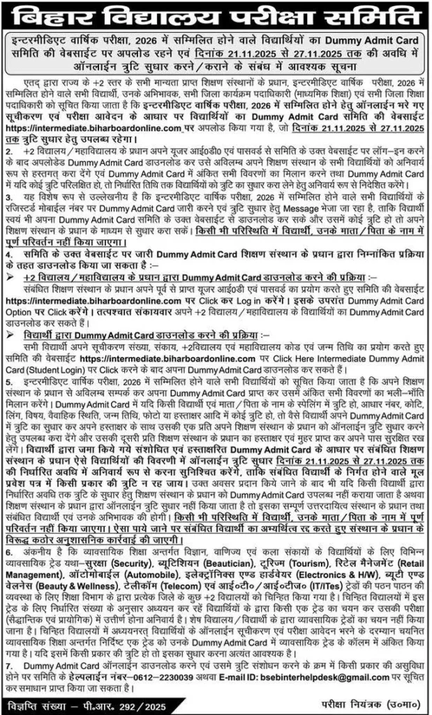 एतद् द्वारा राज्य के +2 स्तर के सभी मान्यता प्राप्त शिक्षण संस्थानों के प्रधान, इन्टरमीडिएट वार्षिक परीक्षा, 2026 में सम्मिलित होने वाले सभी विद्यार्थी, उनके अभिभावक, सभी जिला कार्यक्रम पदाधिकारी (माध्यमिक शिक्षा) एवं सभी जिला शिक्षा पदाधिकारी को सूचित किया जाता है कि इन्टरमीडिएट वार्षिक परीक्षा, 2026 में सम्मिलित होने हेतु ऑनलाईन भरे गए सूचीकरण एवं परीक्षा आवेदन के आधार पर विद्यार्थियों का Dummy Admit Card समिति की वेबसाईट https://intermediate.biharboardonline.com_पर अपलोड किया गया है, जो दिनांक 21.11.2025 से 27.11.2025 तक त्रुटि सुधार हेतु उपलब्ध रहेगा।