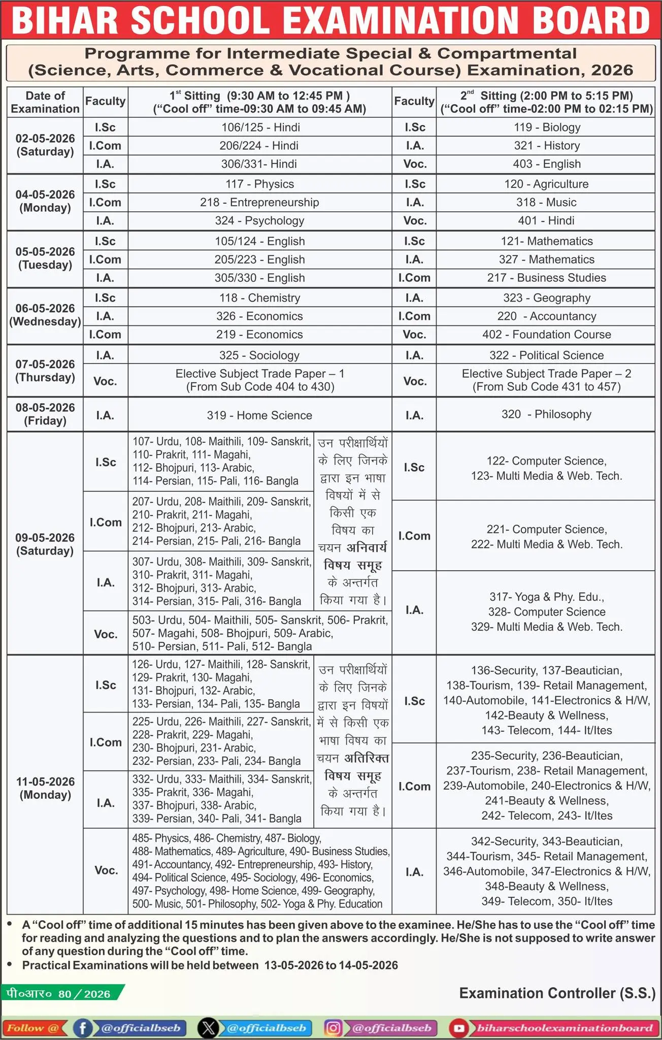 बिहार विद्यालय परीक्षा समिति के द्वारा इंटरमीडिएट कंपार्टमेंटल सह विशेष परीक्षा 2026 का रूटीन जारी कर दिया गया है। यह परीक्षा 02 मई 2026 से शुरू होकर 11 मई 2026 तक आयोजित की जाएगी।